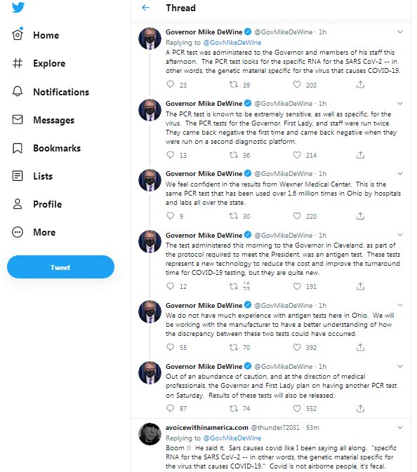 Later in a tweet on twitter @GovMikeDewine a statement was made that PCR tests look for the specific RNA for the Sars Cov-2 : in other words, the genetic material that CAUSES covid-19. (Did you get that, re-read because what I'm about to show is what I have found in two separate articles that Covid-19 is not an airborne virus but is spread via fecal.) I have stated this back in March in my breaking news section under archives and have been protesting the mask mandate since then. Read the last statement made by me within that tweet.