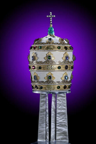 Exhibit B - The Papal Mitre : As previously stated, since no pope has been officially crowned with a tiara since 1963 they do have the option to wear one if they so choose. Most have opted for the mitre. The mitre is actually a representation of the crown also known as a tiara. Below you will see the correlation between the crowns and the mitre above if you use your eyes to discern. The pope in these pictures below is definitely wearing a mitre crown which is a representation of the Tiara Crown.