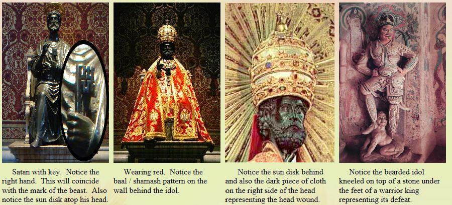 Meet Satan. The first three pictures from left to right are supposedly of St. Peter Enthroned within the Basilica. It is a Bronze Idol now attributed to late 13th-century sculptor Arnolfo di Cambio (some still date it back to the 5th century). It is robed and crowned on high festivals, and its outstretched foot is smoothed down due to centuries of pilgrims' caresses while others kiss the right foot of the idol that proceeds forth.